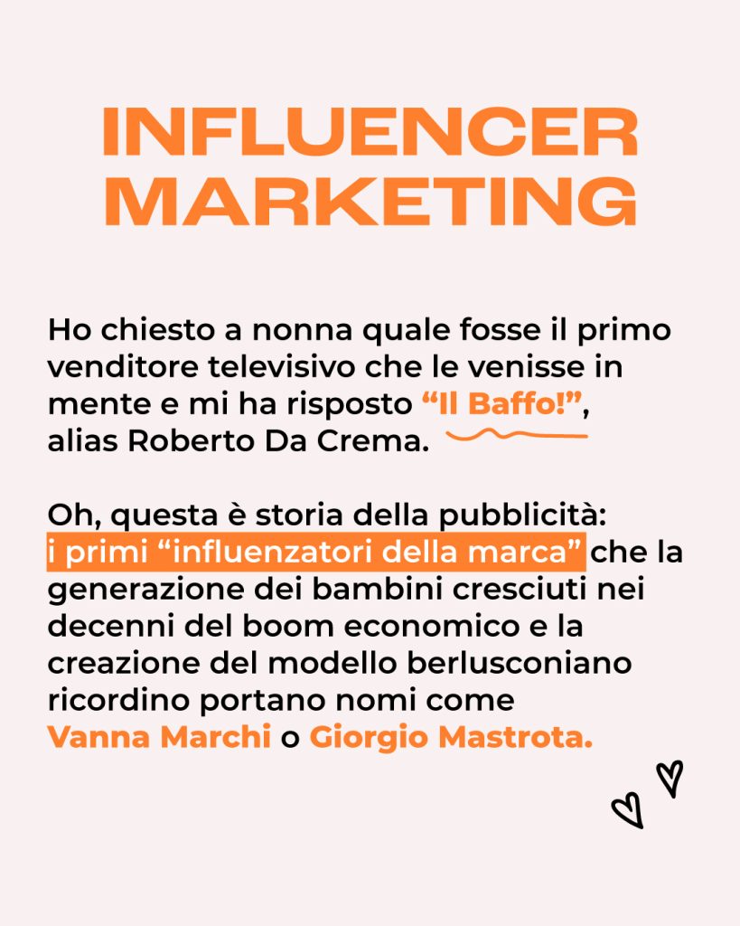 L’influencer marketing è un’evoluzione moderna della pubblicità tradizionale, ma la sua essenza è radicata in pratiche di marketing molto più antiche. Pensiamo ai pionieri della pubblicità come Roberto Da Crema o Vanna Marchi, che avevano il potere di influenzare il pubblico con il loro carisma e le loro apparizioni in televisione. Oggi, l’influencer marketing si basa su un concetto simile: invece di utilizzare celebri testimonial della TV, le aziende collaborano con influencer sui social media per inserire i loro prodotti in contenuti quotidiani e autentici.