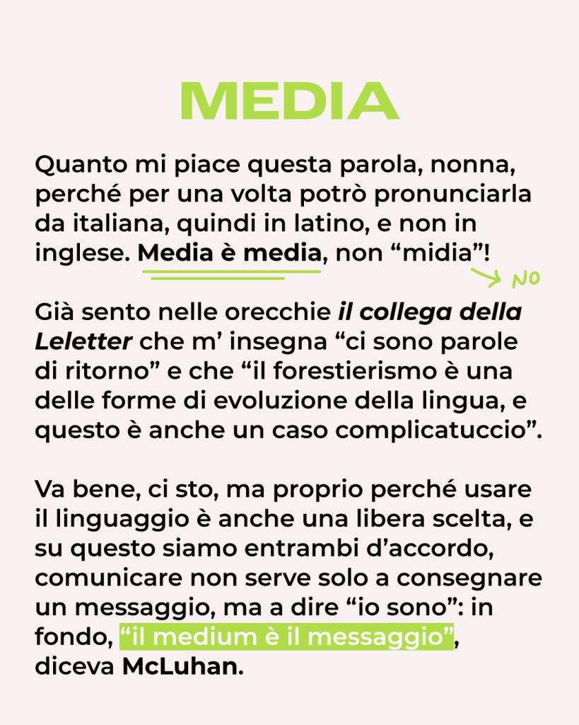 Sul profilo IG di Nagency, settimanalmente, una lettera del tradizionale alfabeto marketing viene rivisitata in chiave attuale, selezionando una parola o un’espressione, in questo momento trend topic, che ci aiuta a parlare, con un tocco di TOV Nagency, del nostro lavoro “a prova di nonna”.